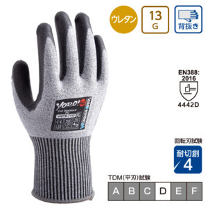 WGYR7110 WONDER GRIP CUT RESISTANT GLOVES YOROI461 Black Urethane ワンダーグリップ 耐切創手袋 YOROI461 黒ウレタン HOME WGYR7110 ワンダーグリップ 耐切創手袋 YOROI461 黒ウレタン WGYR7110 WONDER GRIP 耐切創手袋 YOROI461 黒ウレタン 特長 切れにくい! 破れにくい! 耐切創手袋。耐切創レベル4/D。 ●黒ウレタンコーティング、ウレタンの表面が適度なグリップ力を提供。 ●13G編み。 ●高強力ポリエチレン繊維「ツヌーガ®」が使用されています。 素材コーティング:ポリウレタン 本体:合成繊維(ツヌーガ®)・ガラス繊維・ポリエステル・ナイロン・ポリウレタン(スパンデックス) カラーブラック杢 サイズ S / M / L / XL JANコード S : 4518406071105 M : 4518406071112 L : 4518406071129 XL : 4518406071136 サイズ表 サイズ 全長 中指の長さ 手の平まわり S 22.0 7.5 18.0 M 23.0 7.8 19.0 L 24.0 8.2 20.0 XL 25.0 8.6 21.0 EN388に基づいた品質基準 欧州(EN)の統一規格のもと手袋に求められる安全性を表記する基準。 WONDER GRIP ブランドトップを見る WONDER GRIP 商品紹介を見る WONDER GRIP 電子カタログを見る