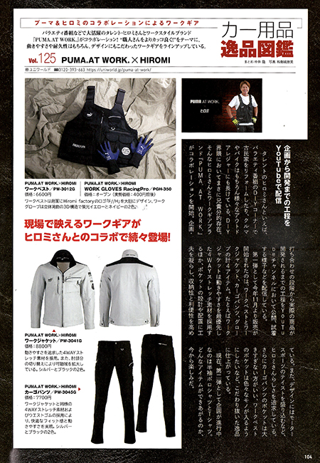 特集「カー用品逸品図鑑」記事にて、「PUMA.AT WORK.」がタレントのヒロミさんとコラボし企画・販売を行う「PUMA.AT WORK.×ヒロミ」コンテンツの以下商品が掲載されております。